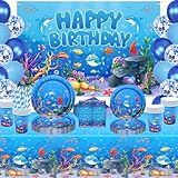 - Forniture per Feste di Compleanno Sull'oceano: otterrai 1 sfondo per la festa dell'oceano blu HAPPY BIRTHDAY + 10 decorazioni per animali subacquei + 18 palloncini in lattice con motivo a pesce + 20 piatti da 22,9 cm + 20 piatti da dessert da 17,8 cm + 20 bicchieri di carta da 9 once + 20 tovaglioli + 20 cannucce + 1 copritavolo Ocean Sea Life + 1 palloncino blu numero 1 da 40 pollici, 2 nastri saranno perfetti per decorare la tua festa.
