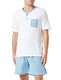• Pigiama uomo due pezzi: il pigiama Remo è composto da una maglia bianca a maniche corte con scollo serafino e tasca a fantasia a righe che richiama quella del pantaloncino corto