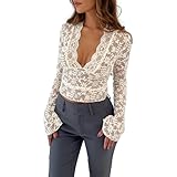 - Design: Top da donna, manica lunga e svasata, collo a V profondo, pizzo floreale, top trasparenti, molto sottili e alla moda.