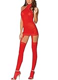 ROSVAJFY Babydoll Lingerie Donna Sexy Mini Abito con Calze, Biancheria Intimo Camicia da Notte Prospettiva Hot Bodystocking Mini Vestito Completi Intimi Maglia Body Halter con Reggicalze (Rosso)